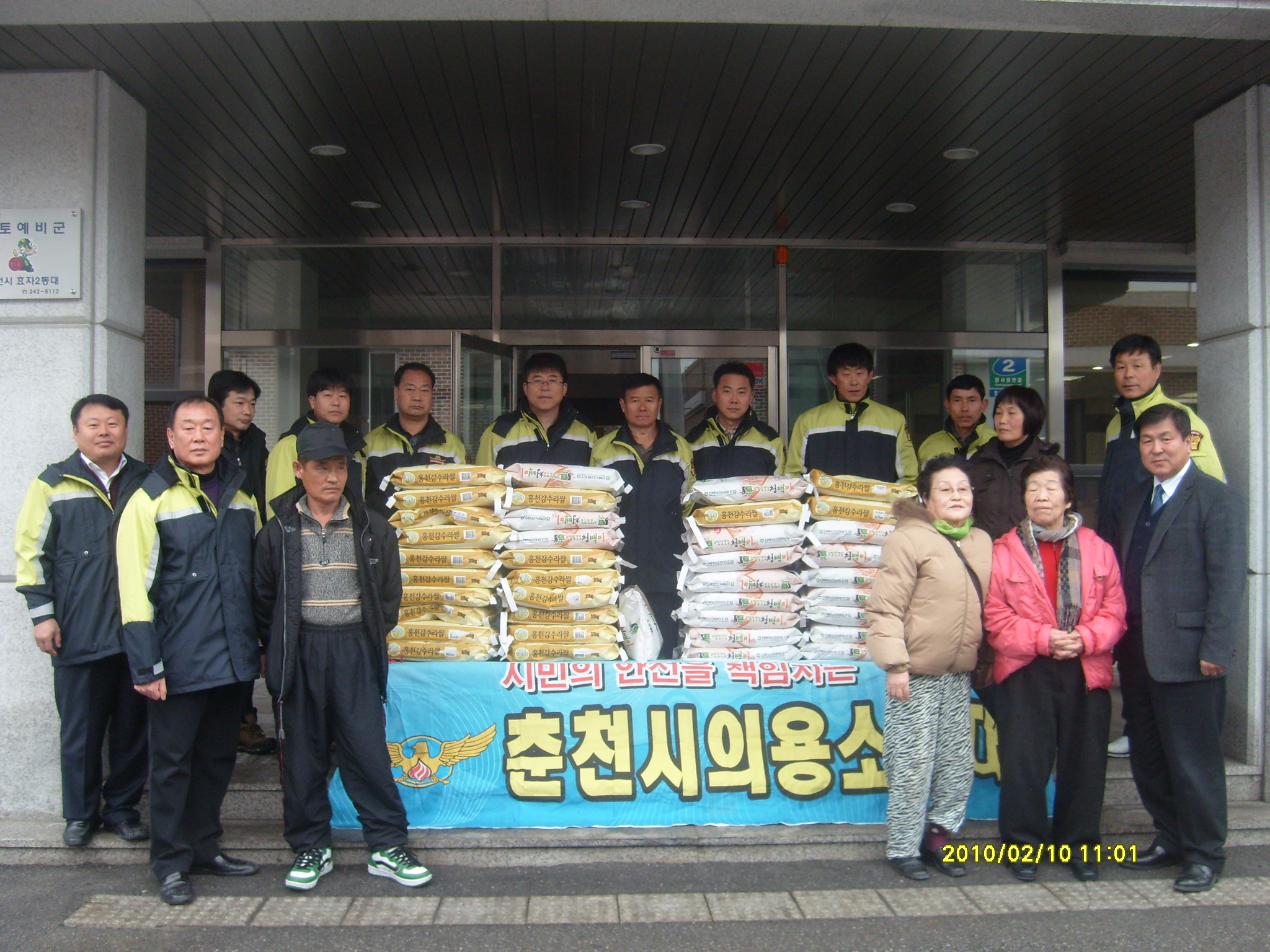 춘천의용소방대(대장 이돈균)에서는 민족고유의 설을 맞이하여 2월 10일 11시 효자2동 주민자치센터에서 대원 20여명이 참석하여 독거노인 20명에게 쌀 10kg 40포를 전달하고 집까지 동행하는 봉사활동을 하였습니다.