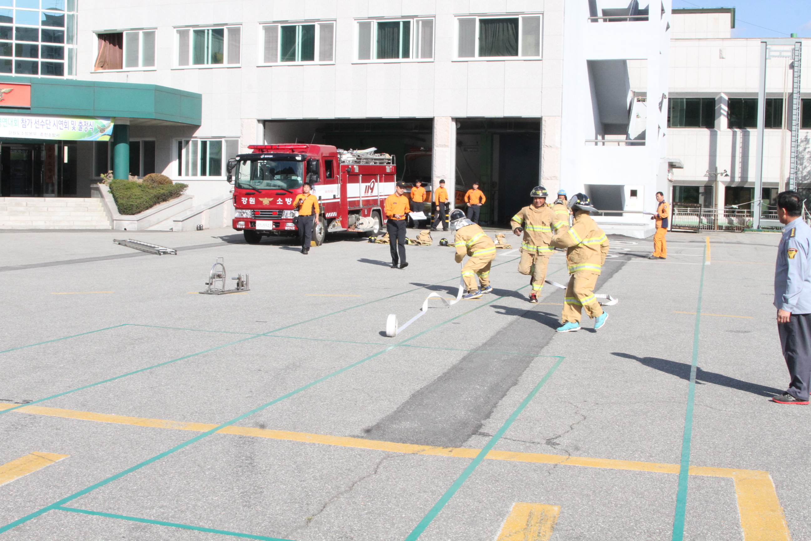 춘천소방서(서장 박창진)은 10.12(월) 14:00 제28회 전국소방기술·전술경연대회 참가 선수단의 출정식 및 종목별 시연회를 개최하여 선수단 격려 및 기량을 점검하는 시간을 가졌습니다. 시연회는 구급분야, 구조분야, 의용소방대 단체분야, 전술분야 순으로 진행되었고 우리 선수단이 전국대회에서 강원도 대표로서 좋은 결과를 이룰 것으로 기대됩니다.