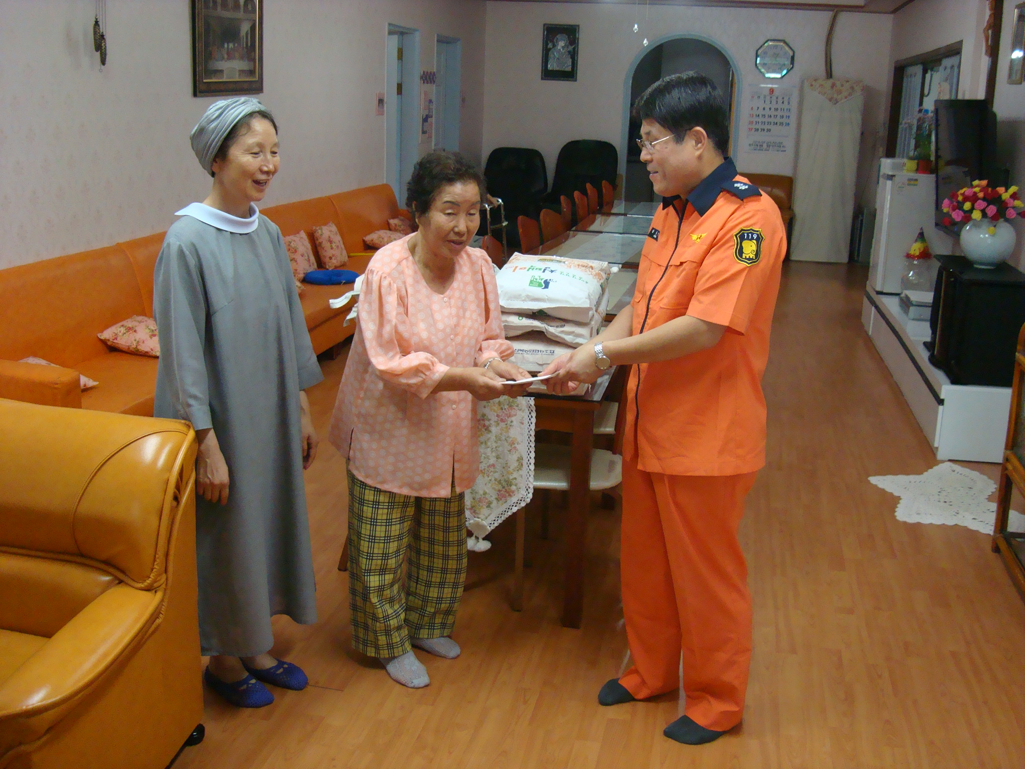 양구119안전센터(센터장 장춘식)에서는 춘천소방서 사랑나눔회의 불우이웃돕기 계획에 따라 민족 최대명절인 추석을 맞이하여 양구읍 석현리에 위치한 사회복지시설인 「안나의 집」을 방문하여 쌀(80kg)과 성금을 전달하고 위로하였습니다.