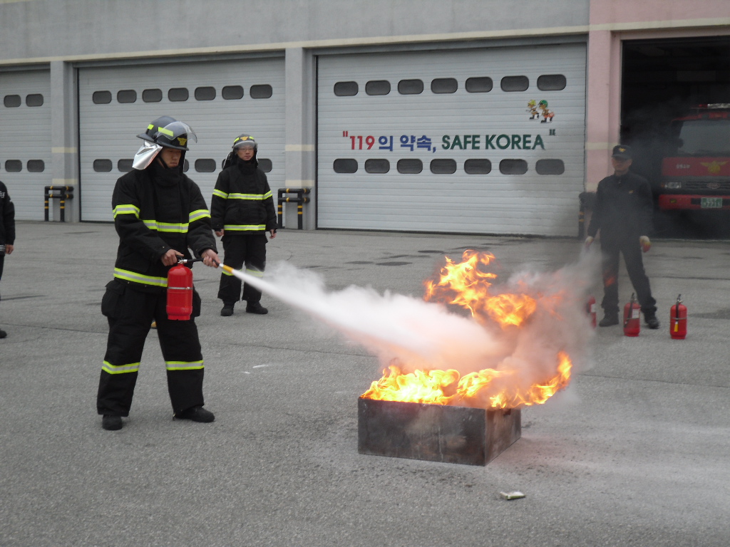 금번 훈련을 통하여, 수동식소화기 작동 및 구조원리와 가상(유류)화재에 대한 초기진압훈련을 반복 숙지함으로써 크고 작은 화재현장에서도 능히 화세보다 우세한 소방력을 확보하는데 첫걸음을 디딤은 물론 소화기의 소중함을 다시 한번 되새기는 소중한 시간이었습니다.