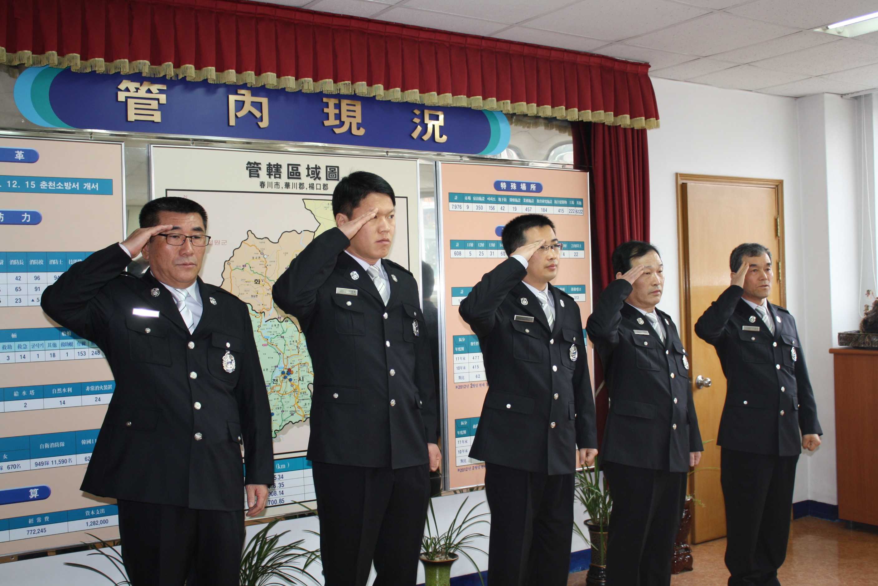 춘천소방서(서장 조완구)는 2012. 3. 13일자 근속승진자 지방소방위 김흥진, 지방소방장 이영복외 4명에 대한 승진임용장 수여식을 가졌습니다. 서장님께서는 임용장 수여 및 계급장 견착후 축하의 말씀과 함께, 승진이란 그에 걸맞는 더 큰 책임이 따르는 것이므로 근무에 최선을 다해줄 것을 당부하셨습니다.