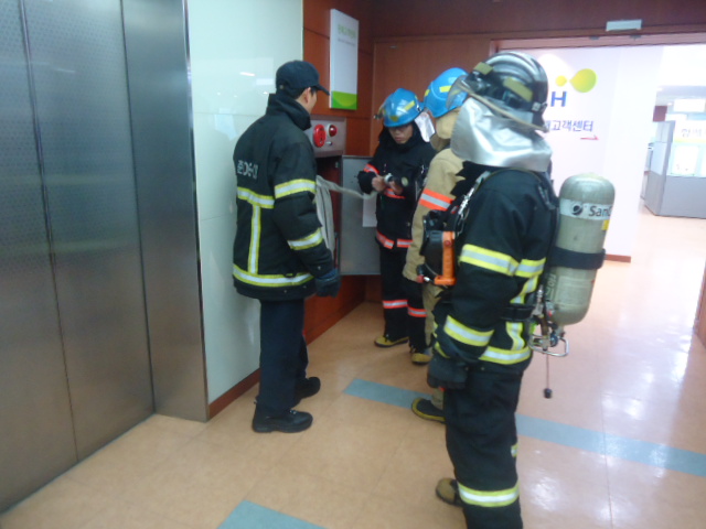 효자119안전센터(센터장 정석찬)에서는 2012.10.24. 14:00~ 에 한국토지주택공사 직원들을 대상으로 소방합동훈련을 실시하였습니다. 자위소방대와 합동으로 진행한 이번 훈련에서는 화재발생시 신속한 대피 및 진압훈련과 직원들에대한 소방안전교육을 실시하였습니다.