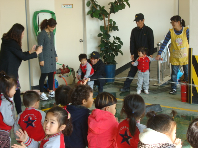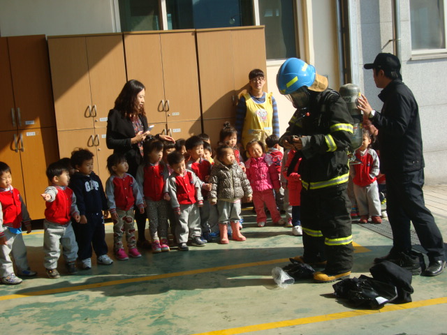 교사분들을 상대로는 화재발생시 대처요령 및 소화기 사용법에 대해서 교육을 실시했고 어린이들을 상대로는 간단한 소방교육과 아울러 소방차와 구급차 견학을 실시했습니다.