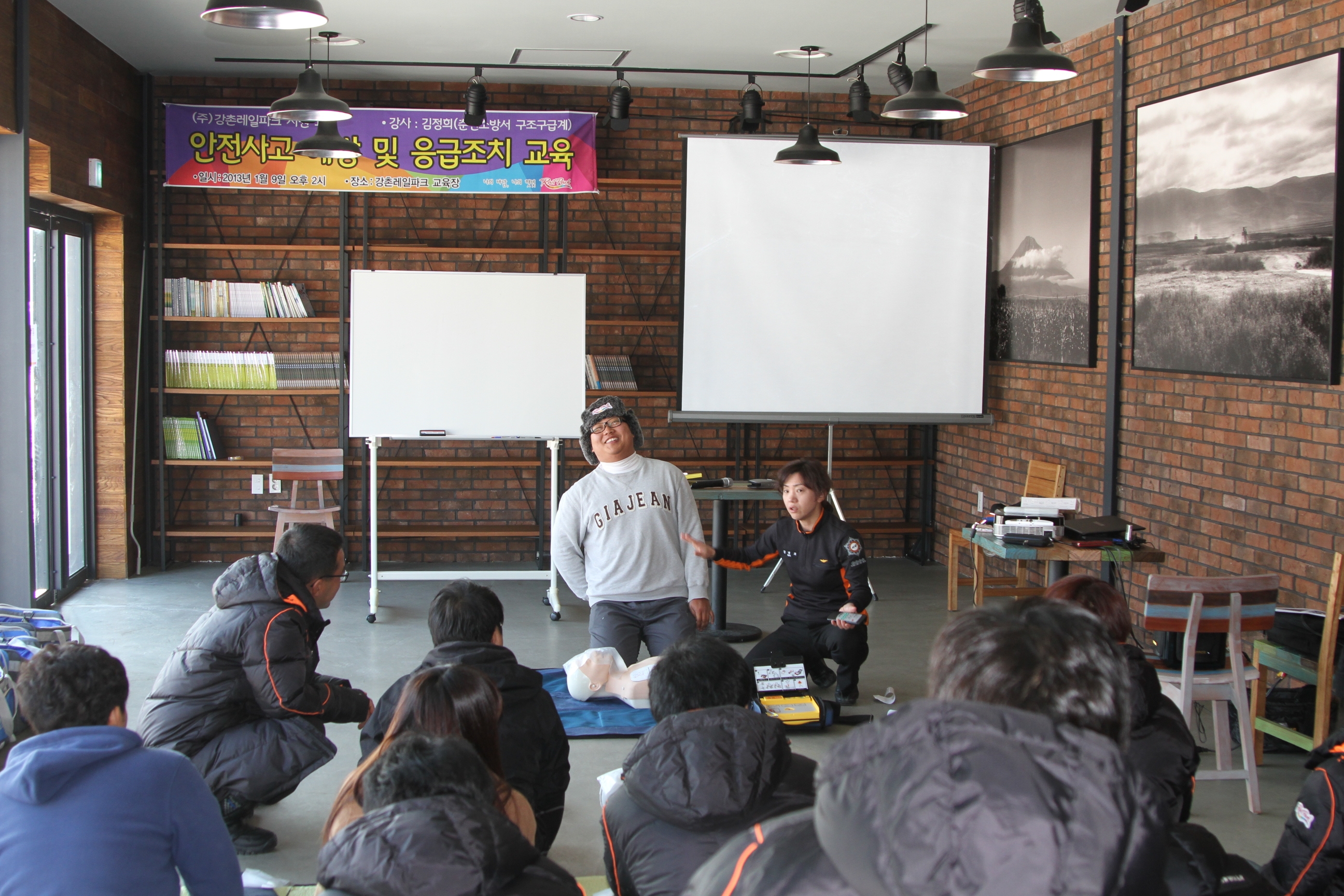 1월9일 14시~16시 강촌레일바이크(정족리) 를 방문하여 직원40명을 대상으로 심폐소생술 및 기초응급처치 교육을 실시했다.