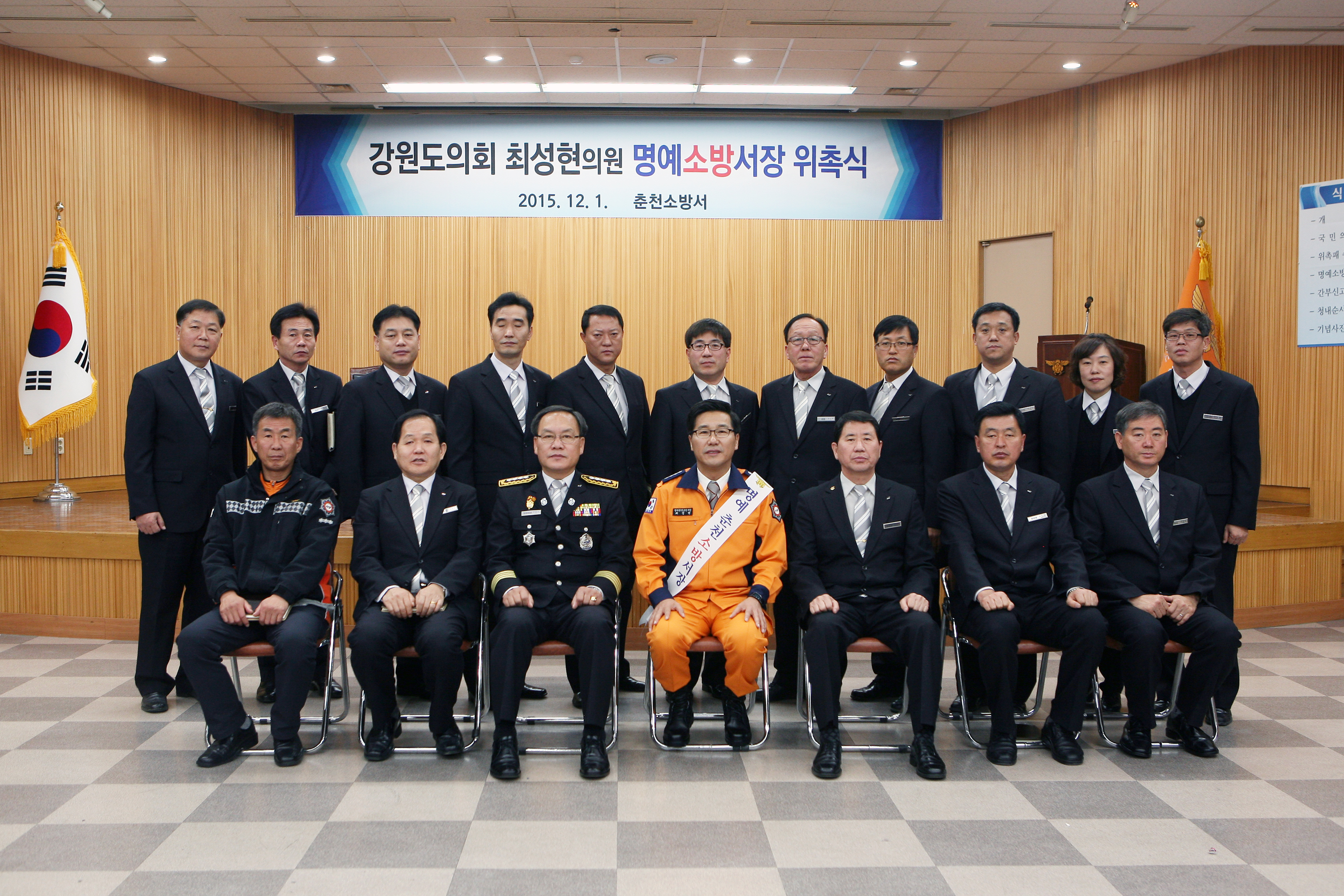 춘천소방서(서장 박창진)는 12월 1일 오전 10시 30분에 춘천소방서 대회의실에서 소방공무원 100여명이 참석한 가운데 최성현 강원도의회 의원을 명예 춘천소방서장으로 위촉하는 행사를 가졌다
