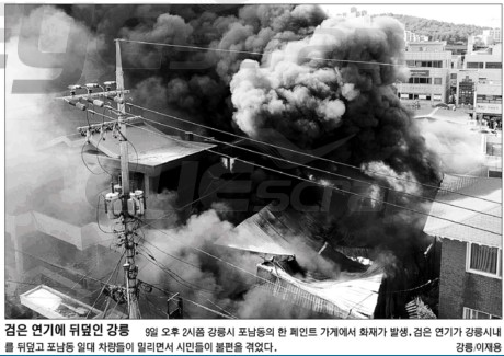 ◇9일 오후 2시5분께 강릉 포남동 페인트 가게에서 발생한 화재로 인해 시커먼 연기가 하늘을 뒤덮고 있다. 강릉=최유진기자 |