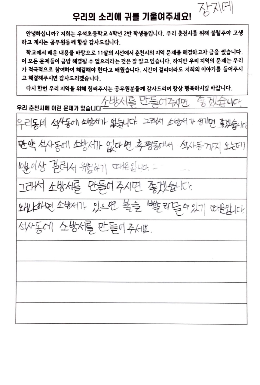 학생들이 춘천시의 지역 문제를 찾아보고 제안하는 글을 썼습니다.
