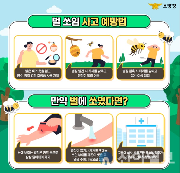 ○ 소방서는 벌 쏘임 예방을 위해 향수·화장품 사용을 자제하고, 벌을 유인할 수 있는 강렬한 색상이나 반짝이는 액세서리 대신 무늬 없는 단색 옷 착용을 권장했다. 벌집 발견 시에는 직접 제거하지 말고 반드시 119에 신고하거나 방역 전문업체에 의뢰해야 한다고 강조했다.