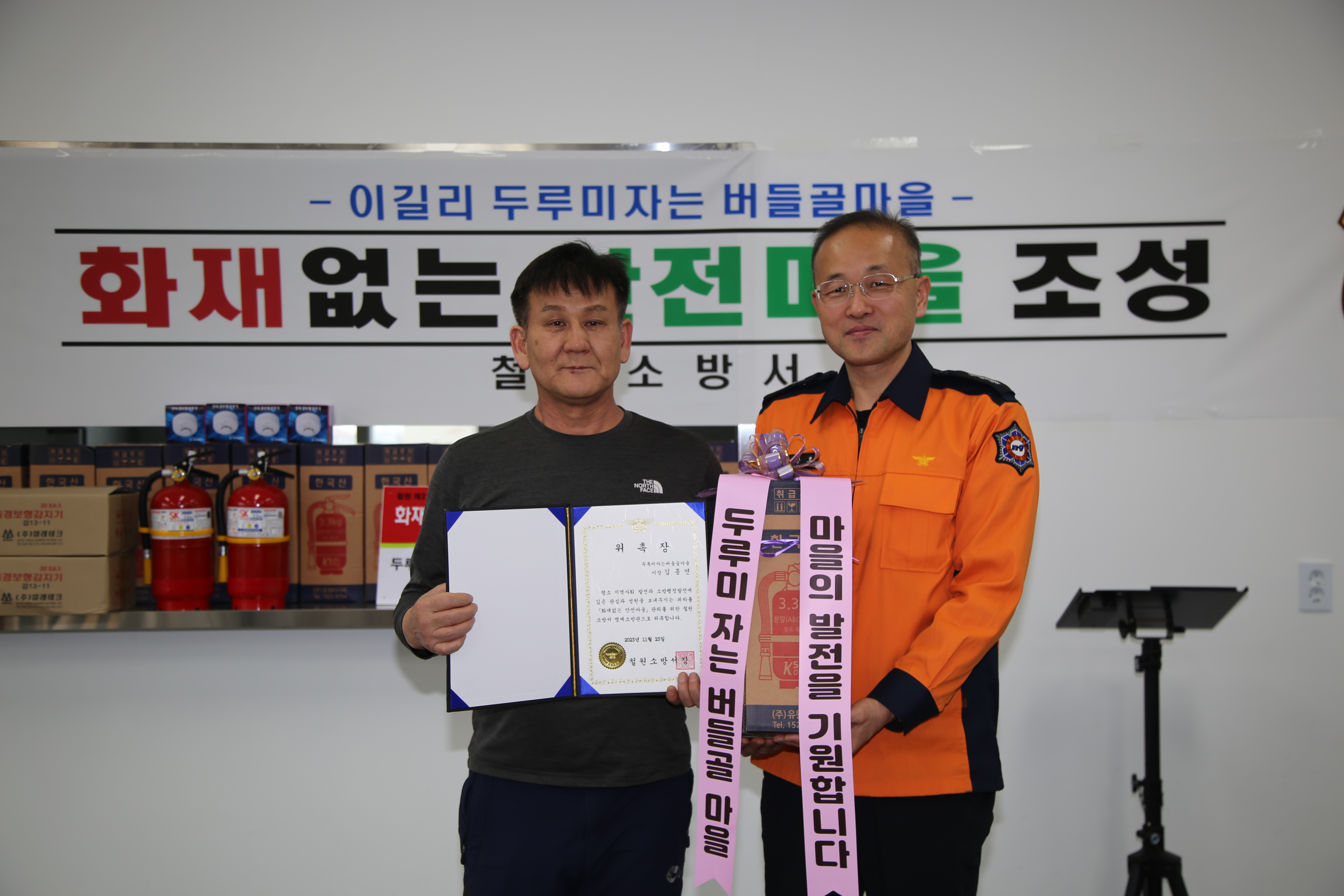 명예소방관으로 위촉된 김종연 이장은 “우리 마을에 화재 없는 안전마을을 조성해 주셔서 감사하고 집집마다 주택용 소방시설을 설치해 화재예방에 더욱더 힘쓰겠다.”라고 말했다.