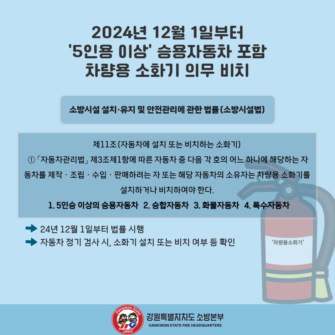 차량용 소화기 의무화, 차량에 비치하세요.