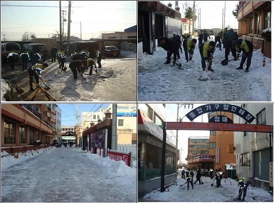 동해소방서 묵호의용소방대(대장 김중기)는 2010.01.04 폭설에 따른 도로내 결빙으로 도보시 장애요인이 자주 발생하여 솔선수범하는 소방이미지를 구현하고자 발한아파트에서 동해중앙시장앞 진입도로에 대하여 제설작업을 실시하였습니다.