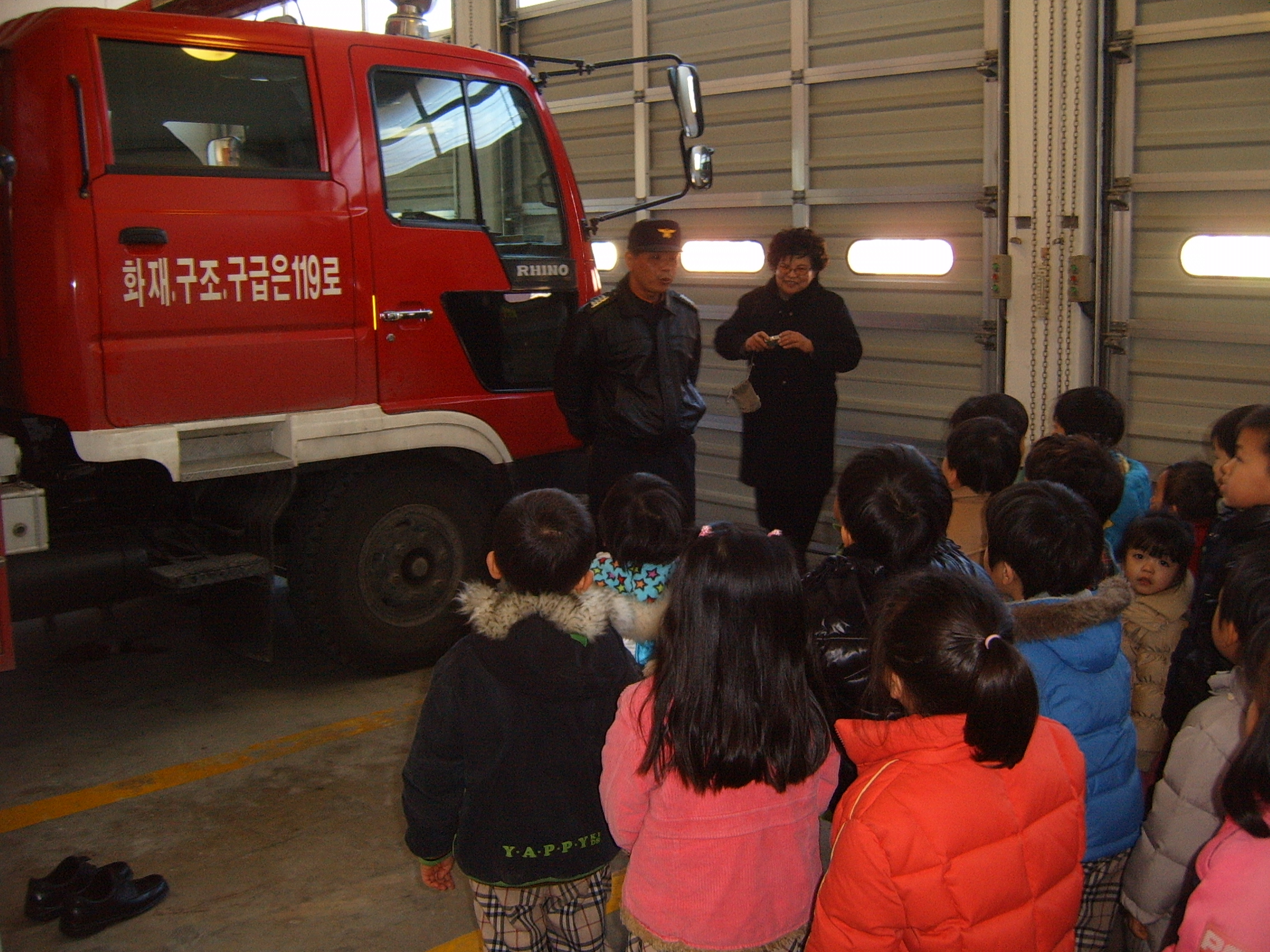 삼화지역대에 2010. 01. 26(화) 11:00시 오랜만에 반가운 꼬마손님들이 찾아왔다. 삼화동에 위치한 신애유치원 선생님과 어린이 30여명이 오늘의 반가운 손님이다. 오늘의 교육은 소방서 임무 및 소방장비소개, 소화기 사용법, 긴급상황시 119신고요령 등 어린이들과 하나가 될 수 있는 눈높이 교육이었다.