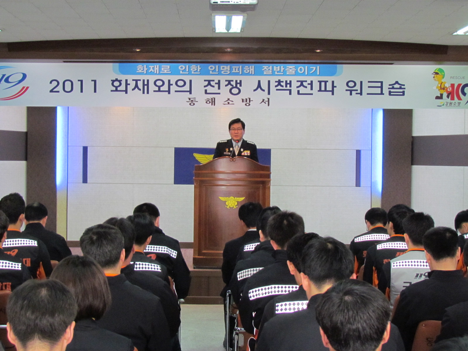 동해소방서(서장 김남숙)는 2일 오전 11시 본서 대회의실에서 화재사망률 50%저감을 위하여 전직원이 참석한 가운데 『2011 화재와의 전쟁 시책전파 전직원 워크샵』을 개최하였다.