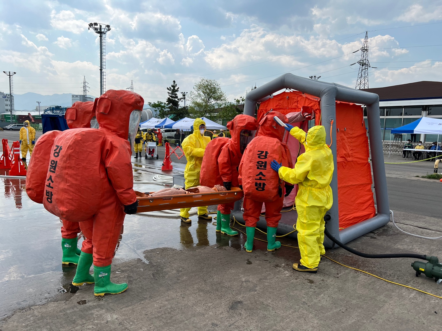 동해소방서(서장 이용길)는 5월17일 오후2시 동해시 송정동 동해항에 정박중인 화물선에서의 유해화학물질인 황산유출사고에 대비한 유관기관 합동 대응훈련을 실시하였다.