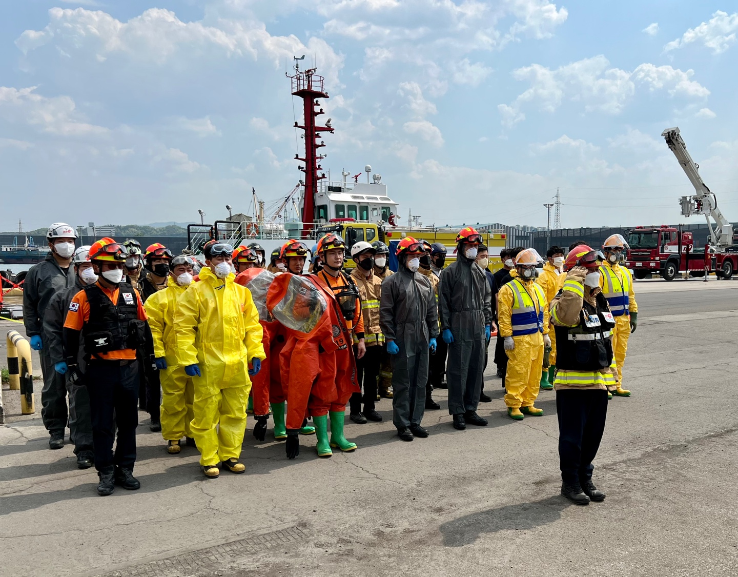 동해항에 정박중인 선박에 유해화학물질인 황산 누출 안전사고 발생하여 ▲ 유관기관간 임무와 역할, 조치사항 등을 유기적인 대비.대응 하고, ▲재난대응 체계 확립과 선박화재 진압 및 구조역량을 강화하기 위한 훈련으로 ▲장비 14대 및 소방관46명이 동원되었다.