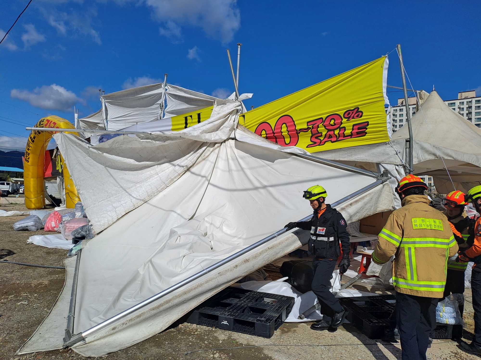소방서에 따르면, 이날 오전 10시경“동해시 단봉동에서 강풍에 대형 몽골텐트가 날아가 구조물에 머리를 부딪혔다”라는 신고가 접수됐다.