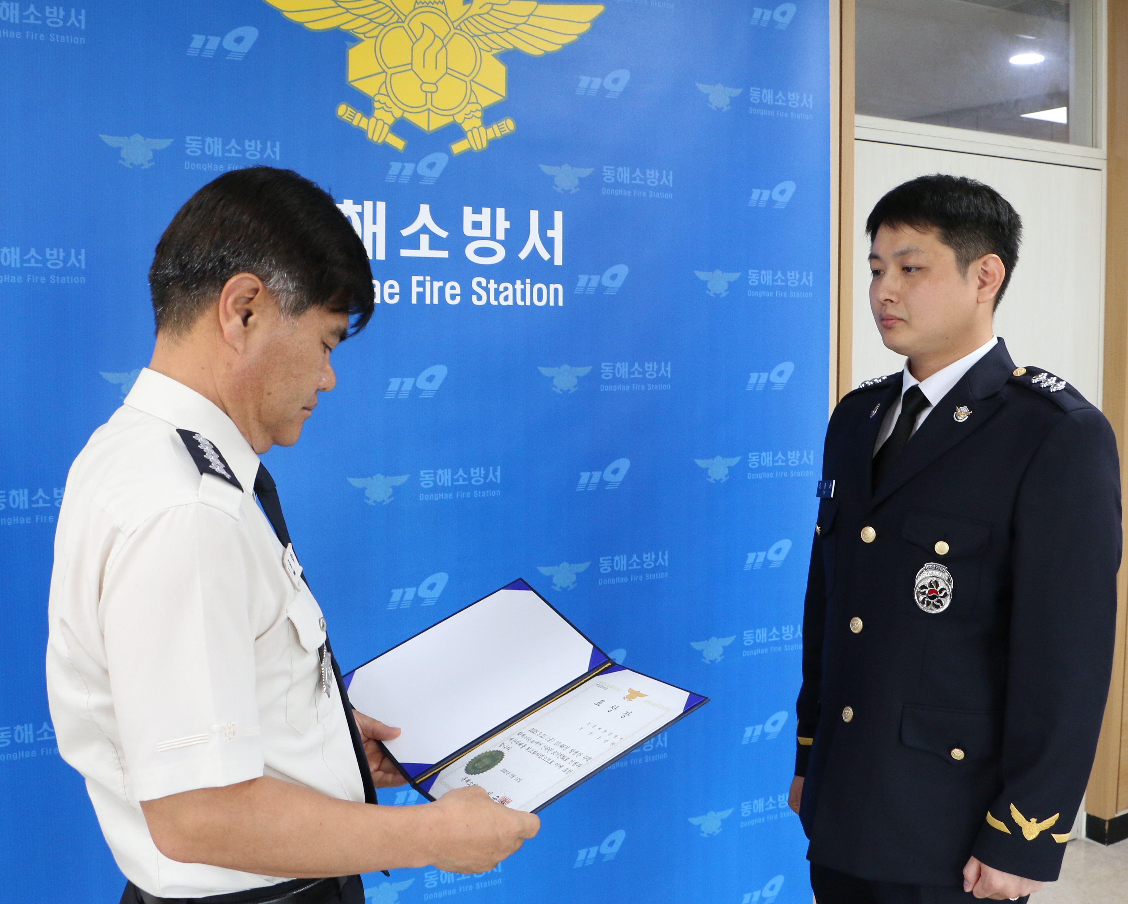 동해소방서(서장 심규삼)는 16일 서장실에서, 신속한 초기 대응으로 화재 피해 확산을 막은 유공자에게 소방서장 표창장을 수여했다.