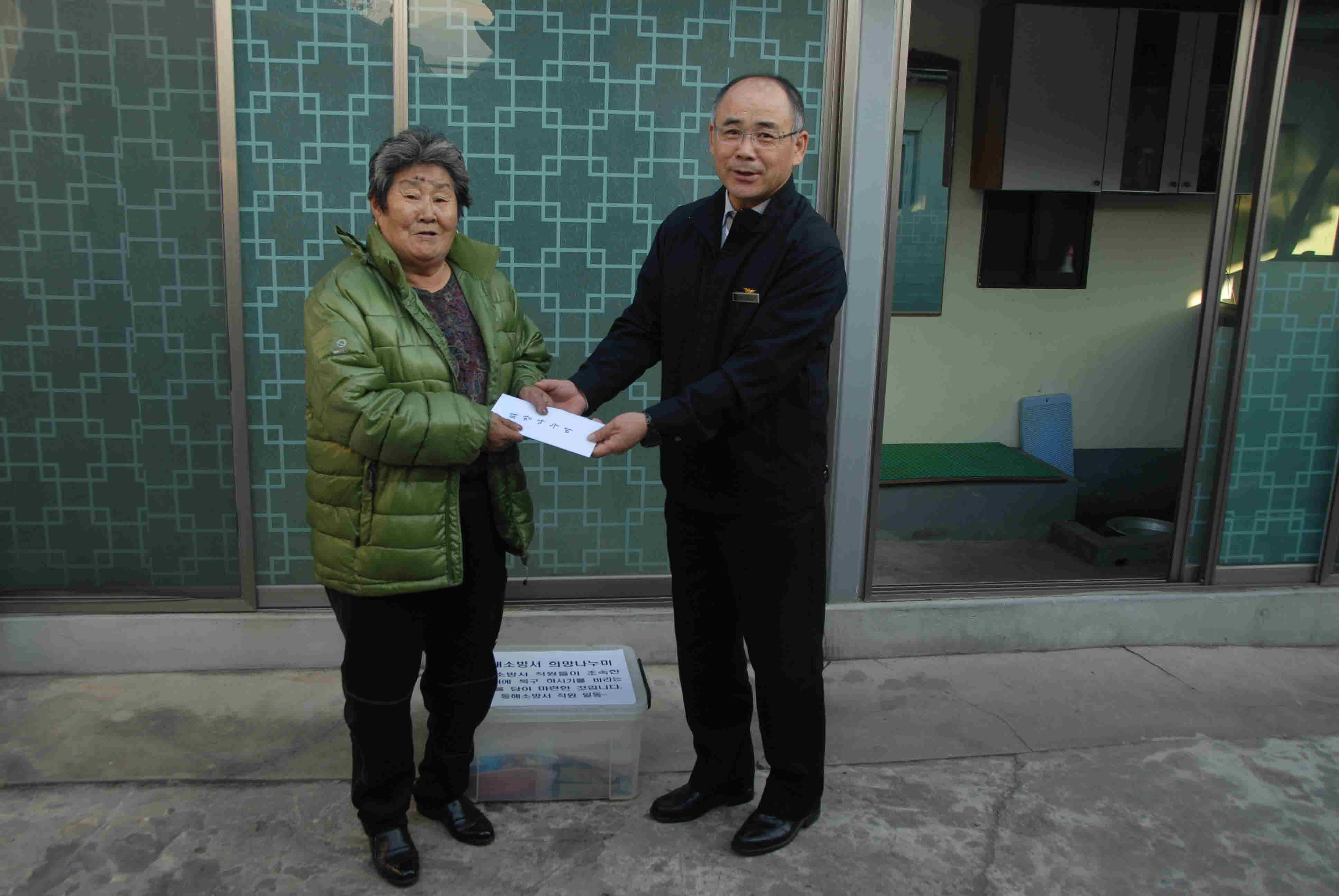 동해소방서(서장 김 기 성)에서는 지난 11월 5일 화재로 인해 주택이 전소된 동해시 효가동 신재형씨에게 동해소방서 직원들이 각 부서에 저금통을 설치하여 동전을 모으고 대형 할인매장에 영수증을 모아 마련한 현금 30만원과 긴급구호세트를 전달 했다.