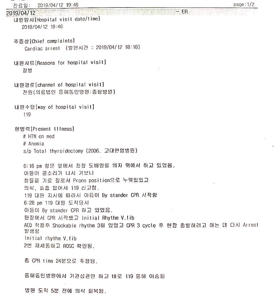 상황이 긴급함에 따라 그때 묵호 북삼 천곡 세곳에서 출동해주셨는데, 119대원 도착 전에 아버지께서 숨이 멎고 맥박도 없고 괄약근이 풀려 대소변이 나오고있어서 저는 사망으로 생각을 하고 있었어요.