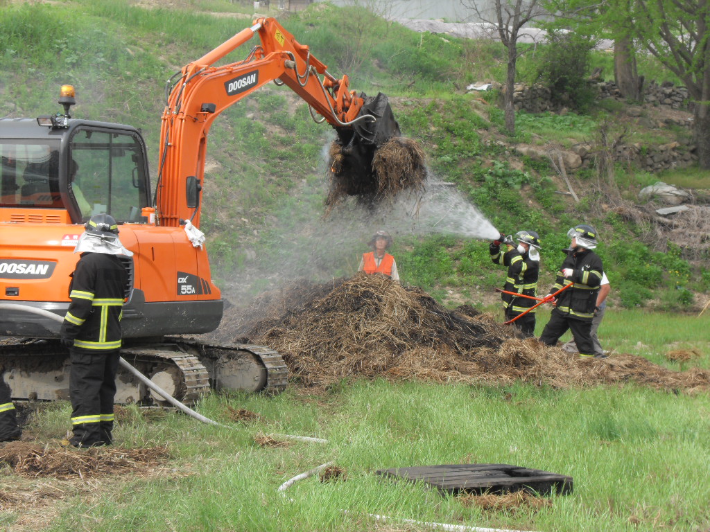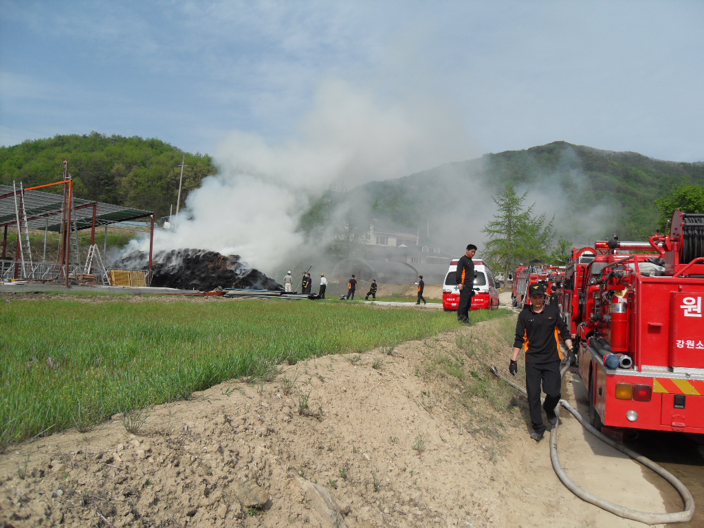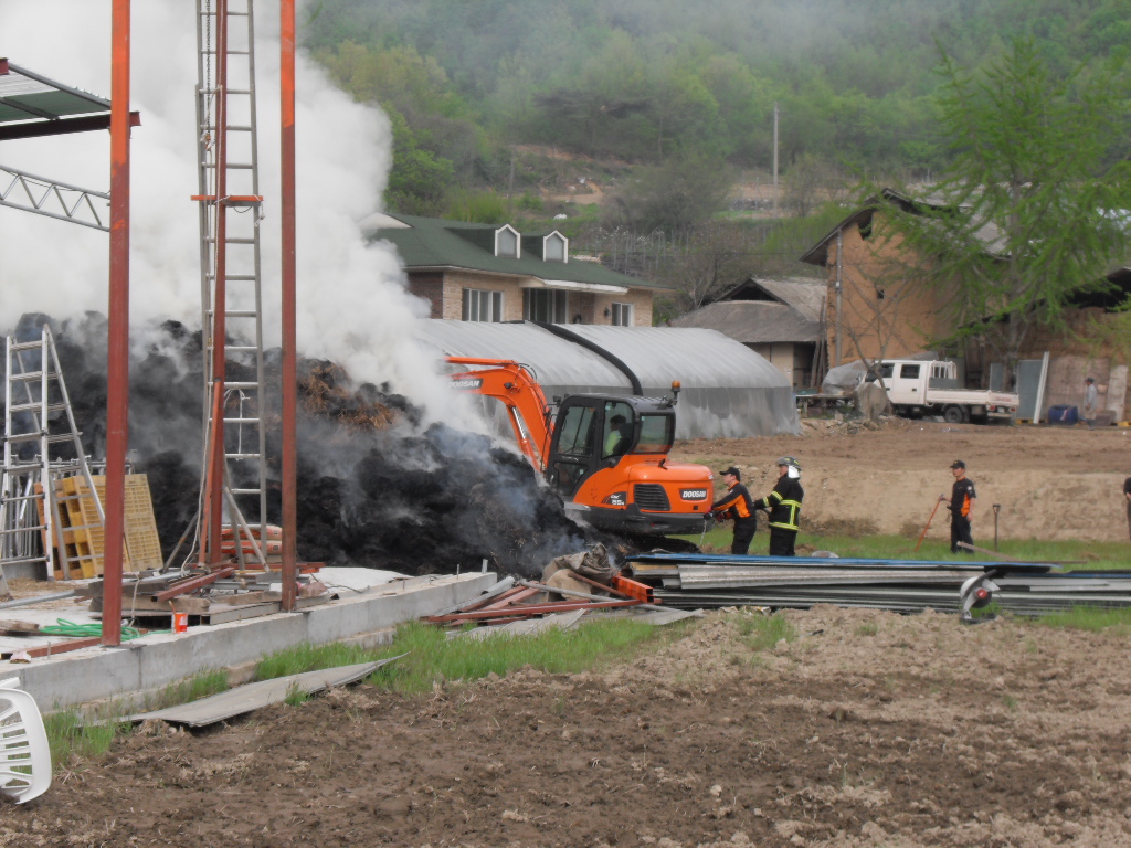 부론의용소방대(대장 김진수)는 5월9일 15시10분경 발생한 정산리 샘골 마을 축사 볏짚 화재에 15명의 대원이 출동 화재진압및 진입로 확보등 화재진압 활동을 진행하였습니다. 이날 화재는 건조한 날씨속에 축사보수 공사중에 용접불똥이 볏짚으로 옮겨붙어 일어난것으로 추정되며 인명피해는 없었으나 볏짚에 붙은 불이 특성상 소화하기가 힘들어 포크레인등 장비를 투입해서 일일이 볏짚을 헤집고 옮기면서 진화하는등 장시간 진화작업이 이뤄졌습니다. 농가에서는 사소한 작업에도 불씨가 옮겨붙을수 있는점등을 주의하여야 하겠습니다. 저녁 늦게 까지 작업에 참여해 주신 대원분들에게 다시 한번 감사드립니다.
