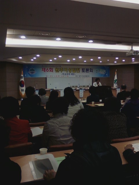 흥업여성대(대장오오석)에서는 2012년 4월 26일 오후3시부터 원주시청 다목적홀에서 열리는 `제6회 여성발전토론회'에 참석하과 왔습니다.원창묵원주시장님, 지은희 원주시여성단체협의회장,여성단체협의회원등 200여명이 참석하였습니다.자유롭고 안전한 지역사회를 만들기 위한 "학교폭력예방"을 주제로 토론이 진행되었습니다.학교폭력 예방을 위한 역활과 실천방안을 제안하고, 자유롭고 안전한 지역사회만들기 위해 저희 여성의용소방대원들도 힘써 돕겠습니다.