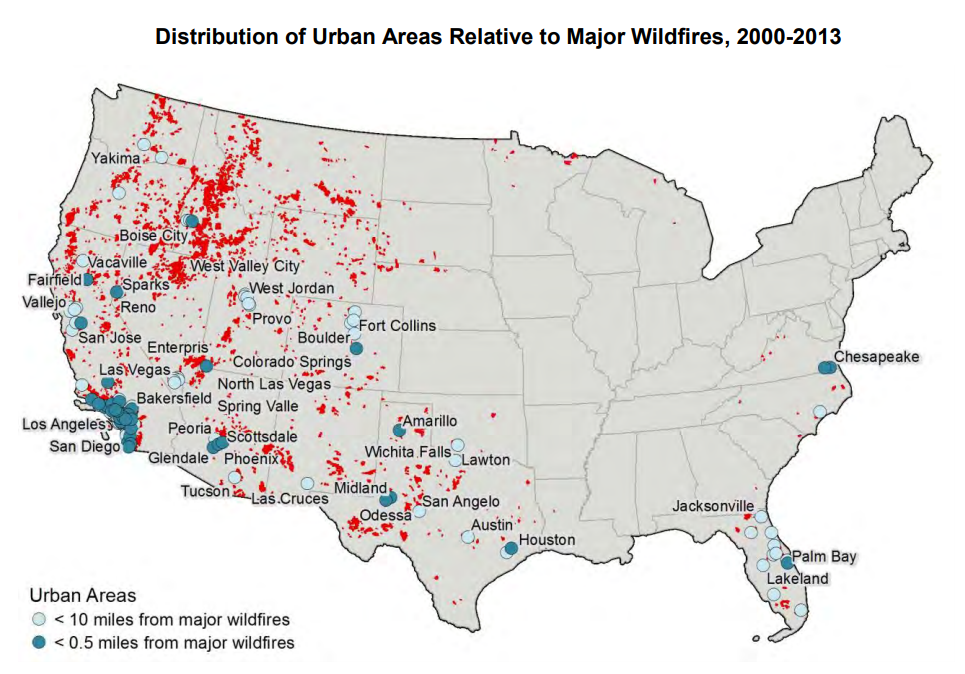 산불은 항상 미국 서부지역의 주요한 문제가 되고 있다. 이러한 산불은 야생지역과 도시의 경계지역의 개발행위로 인해 가속화되고 있다. 게다가 가뭄의 장기화, 계절을 가리지 않고 있는 따뜻한 기온, 기타 기후에 영향을 미치는 요인들이 산불의 빈도와 규모에 영향을 미치고 있다. 앞서 언급한 서부 도시는 창의적인 방식으로 증가하고 있는 산불의 위협에 효과적으로 대응하고 있다.