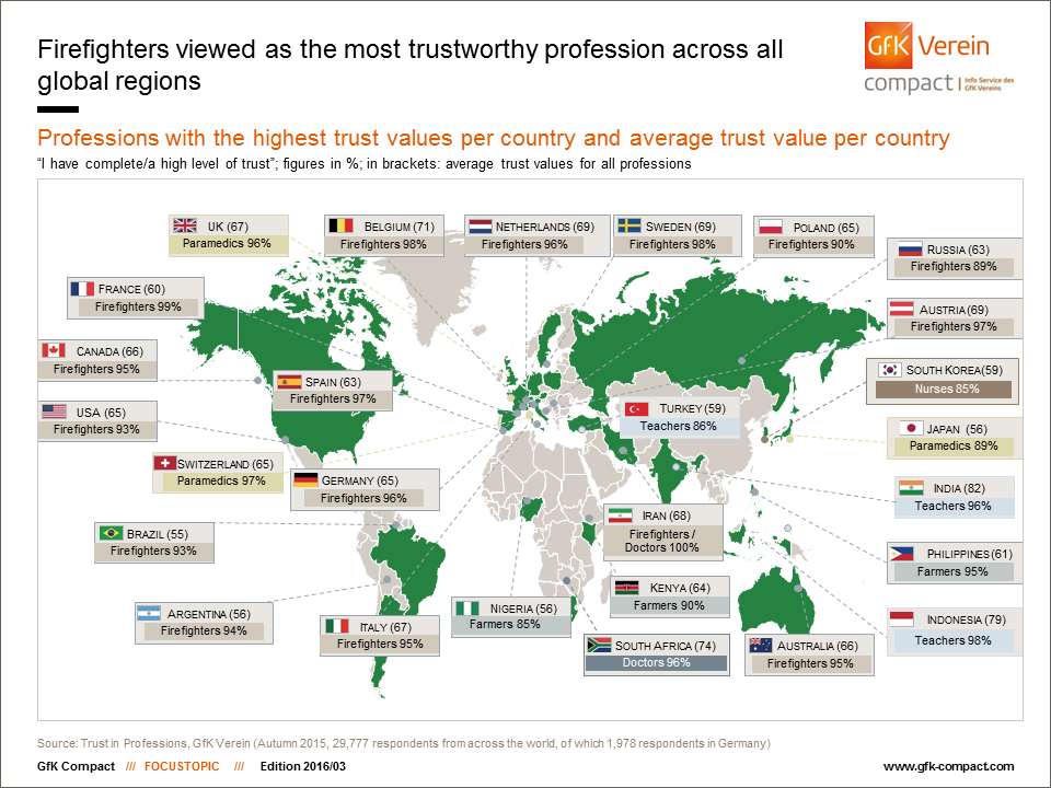 조사한 27개국 중 15개국에서 소방관이 제일 신뢰도가 높게 나왔습니다.