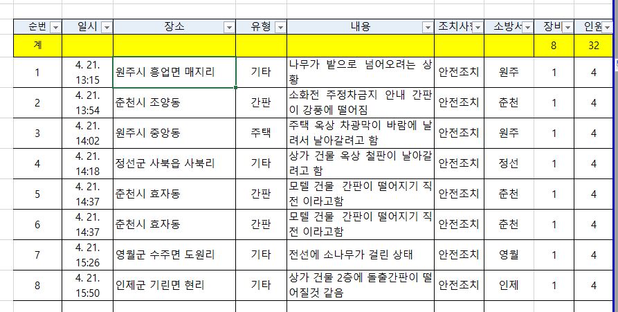 강풍에 따른 안전조치 현황 (4. 21. 16:00 현재)