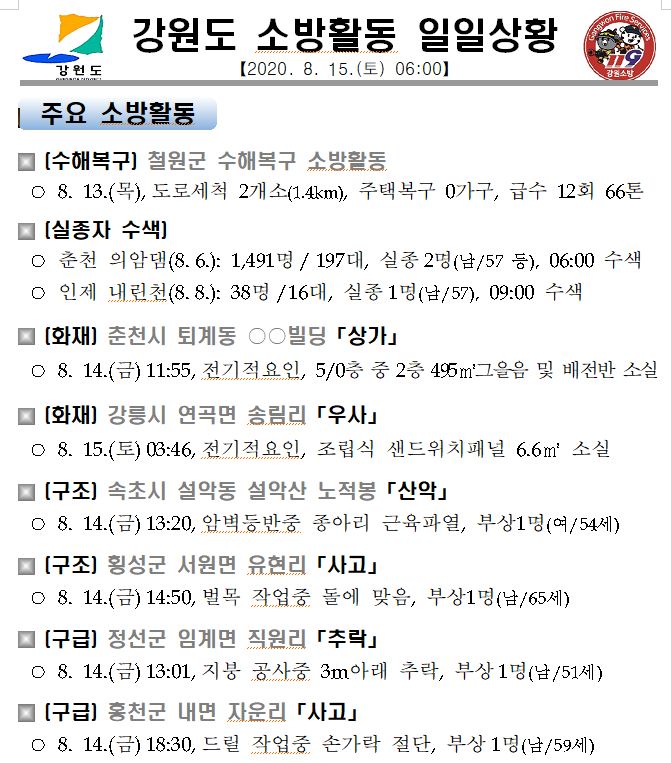 소방활동 일일상황 (8. 15. 토) 06:00