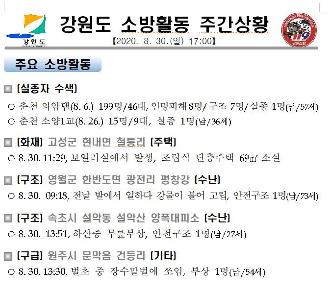 강원도 소방활동 일일상황(8. 30. 일) 06:00