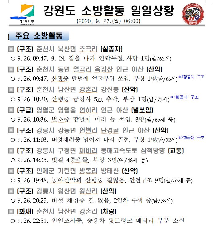 소방활동 일일상황(9. 27. 일) 06:00