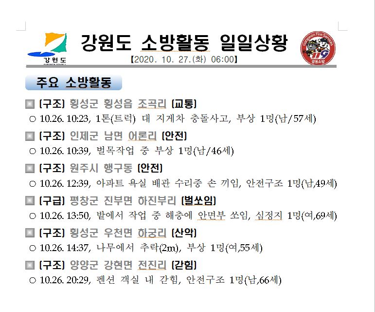 강원도 소방활동 일일상황(10. 27. 화) 06:00