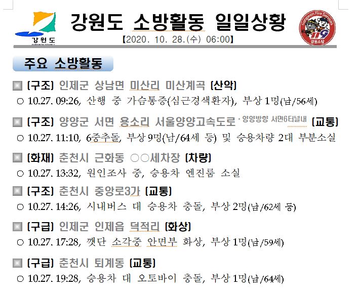 강원도 소방활동 일일상황(10. 28. 수) 06:00