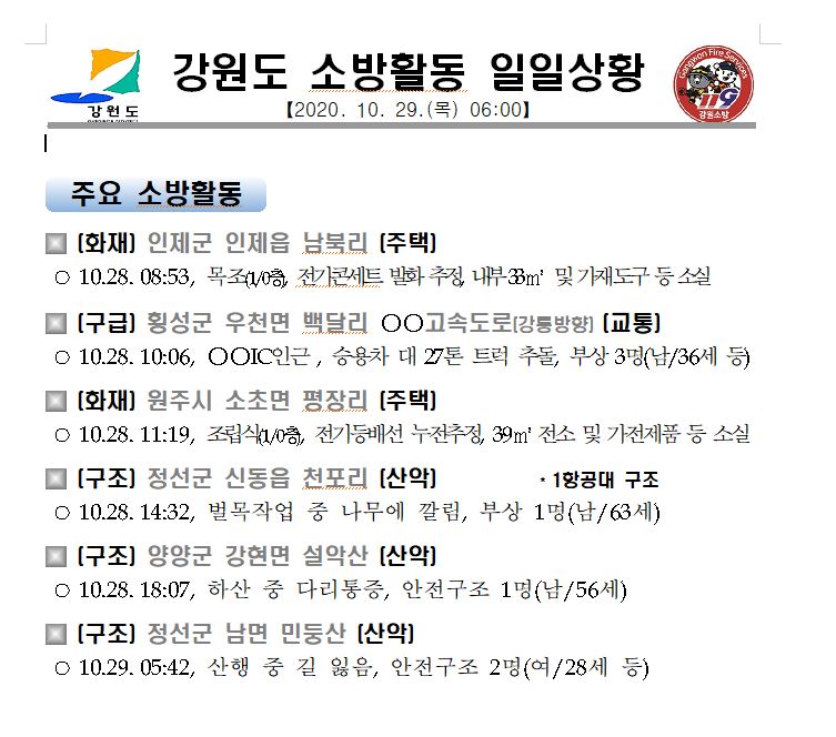 강원도 소방활동 일일상황(10.29.목) 06:00