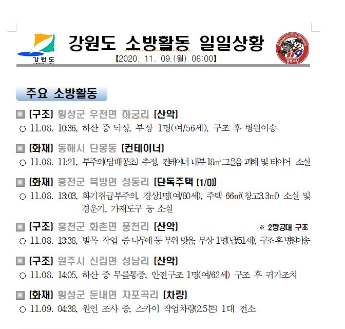 강원도 소방활동 일일상황(11.09.월) 06:00