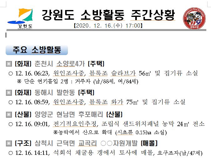 강원도 소방활동 주간상황(12. 16. 수) 17:00