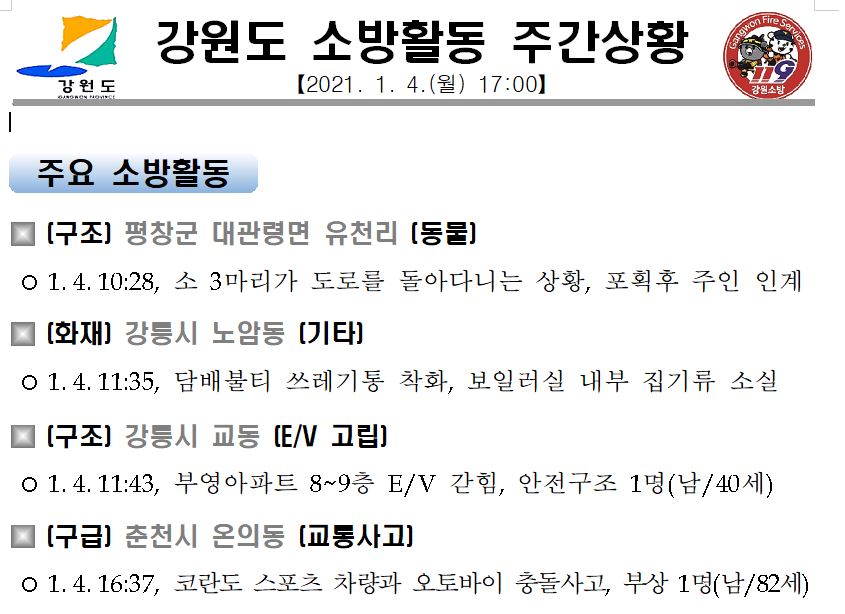 강원도 소방활동 주간상황(1.4.월) 17:00