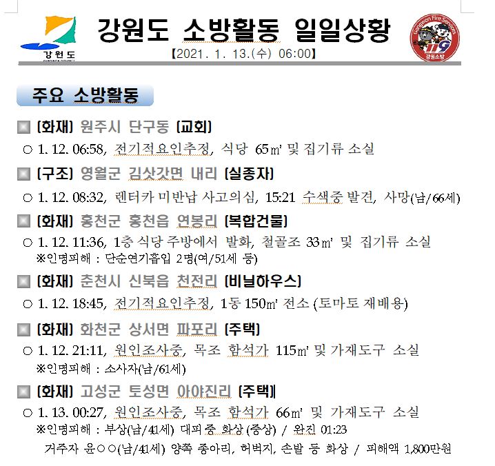 강원도 소방활동 일일상황(1. 13. 수) 06:00
