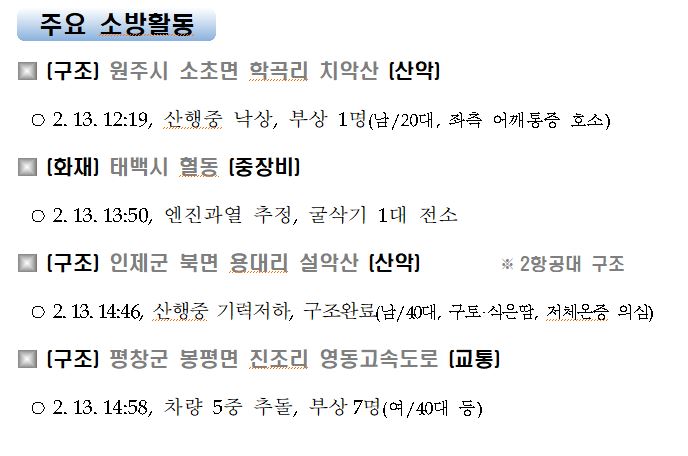 강원도 소방활동 주간상황(2. 13. 토) 17:00