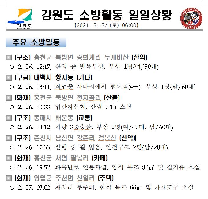 강원도 소방활동 일일상황 (2. 27. 토) 06:00