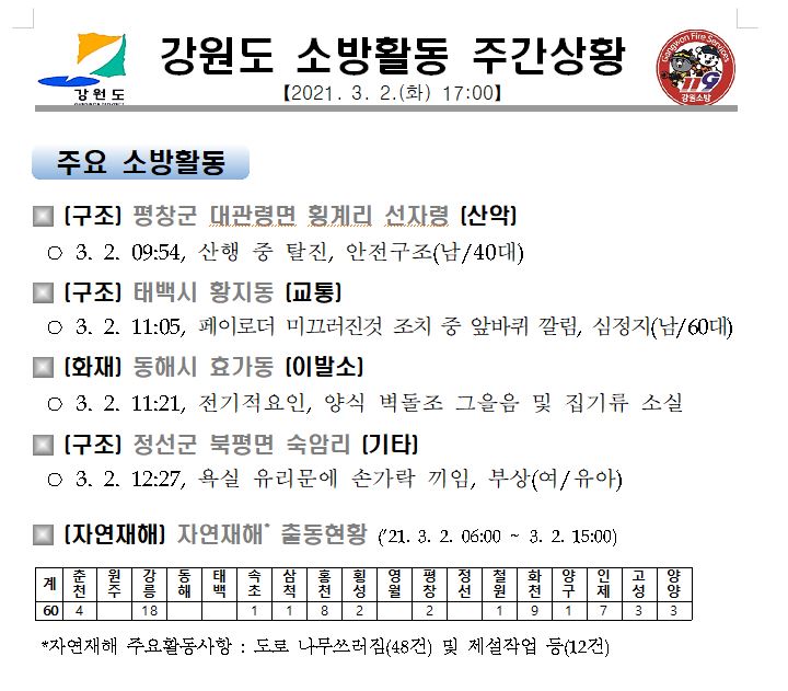 강원도 소방활동 주간상황(3. 2. 수) 17:00