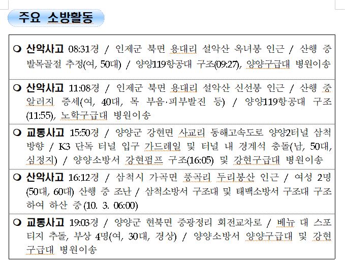강원도 소방활동 일일상황 (10. 3. 일) 06:00