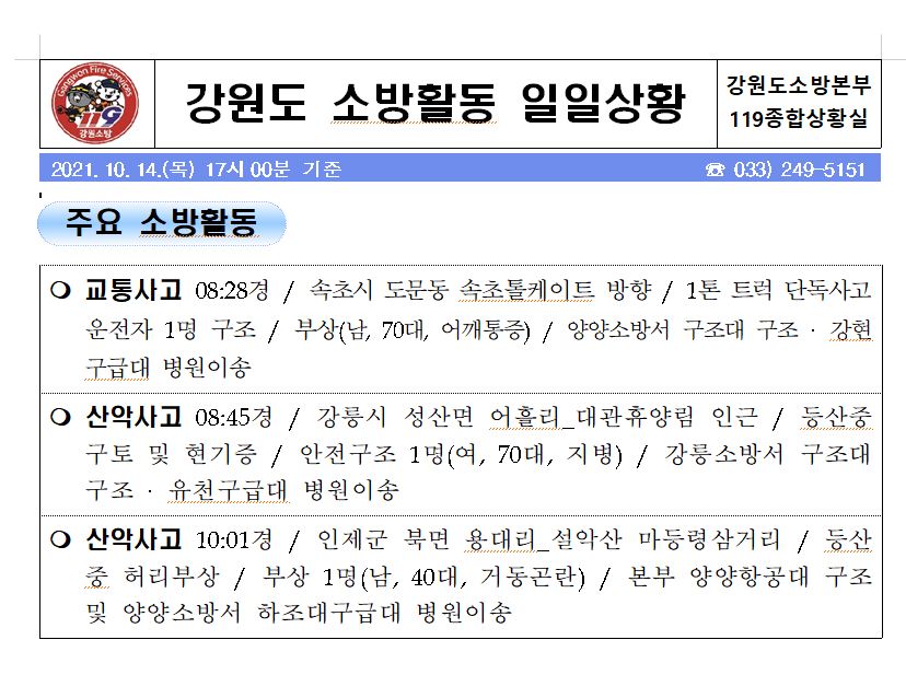 강원도 소방활동 주간상황 (10. 14. 목) 17:00