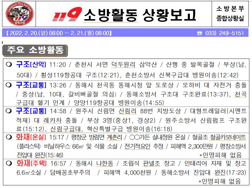 119 소방활동 상황보고(2. 21. 월) 06:00