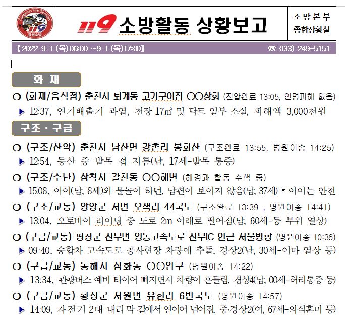 119 소방활동 상황보고(9. 1. 목) 06:00
