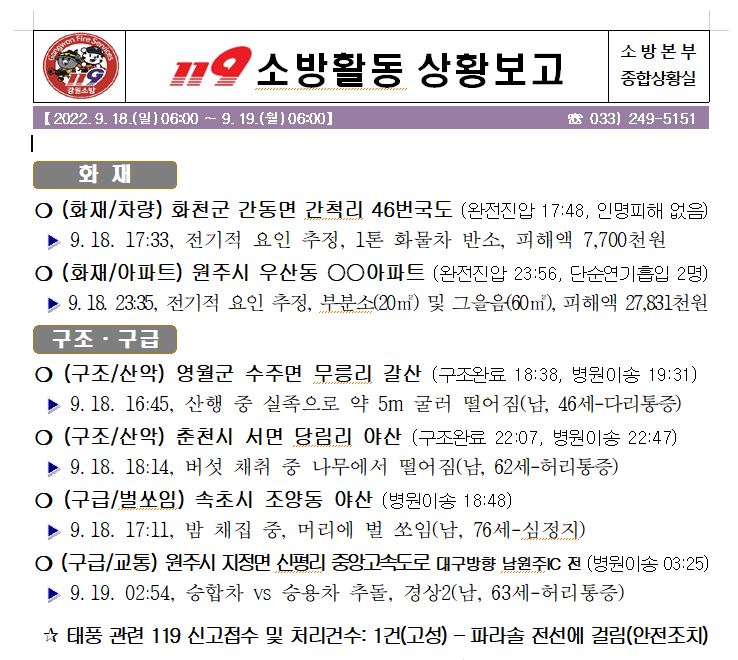 119 소방활동 상황보고(9. 19. 월) 06:00 - 사진 추가