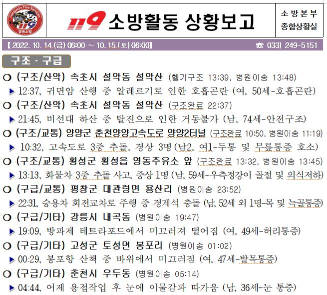 119 소방활동 상황보고(10. 15. 토) 06:00