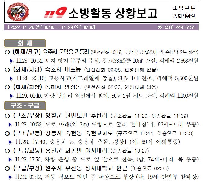 119 소방활동 상황보고(11. 29. 화) 06:00