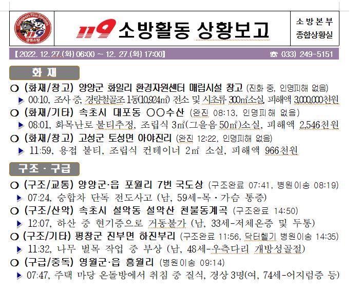 119 소방활동 상황보고(12. 27. 화) 17:00
