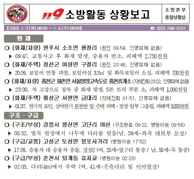 119 소방활동 상황보고(1. 4. 수) 06:00